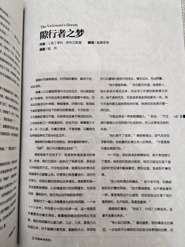 Just received photos of my story “The Veilonaut’s Dream” (originally published at Clarkesworld and subsequently in Best of British Science Fiction 2018) sent by the staff at Chinese magazine Science Fiction World Translations, whilst I wait for the physical copies to arrive. I’m really chuffed, as this is the first time any story of mine has been translated — and for one of the biggest markets there is. “The Veilonaut’s Dream” really has turned out to be the little story that could. (The fantastic magazine cover is the image of “Cheela” from Robert L. Forward’s Starquake, apparently.)